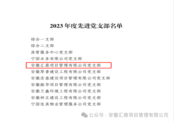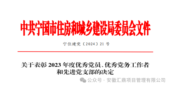 近日,中共宁国市住房和城乡建设局委员会下发《关于表彰2023年度优秀党员、优秀党务工作者和先进党支部的决定》(宁住建党〔2024〕21号),对全市住建行业先进党组织和先进个人进行表彰,汇鼎公司党支部荣获2023年度先进党支部称号。