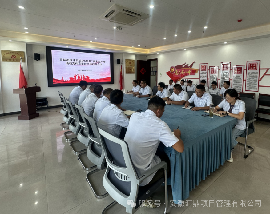 6月17日,汇鼎公司组织全体监理人员召开安全生产专题会议,深入宣贯省住建厅《关于开展2025年全省住房城乡建设系统“安全生产月”活动的通知》(建质函〔2025〕201号)及市安委办相关文件精神。