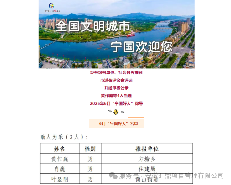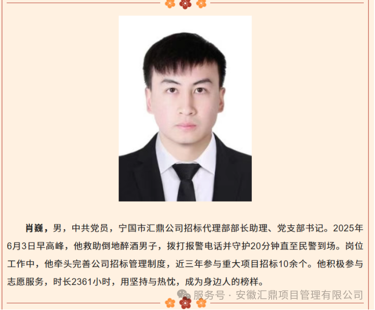 近日,汇鼎公司党支部书记肖巍同志光荣当选2025年6月“宁国好人”。这一荣誉的获得,既是对肖巍同志个人品德的高度认可,更是对公司企业文化建设成果的充分肯定。